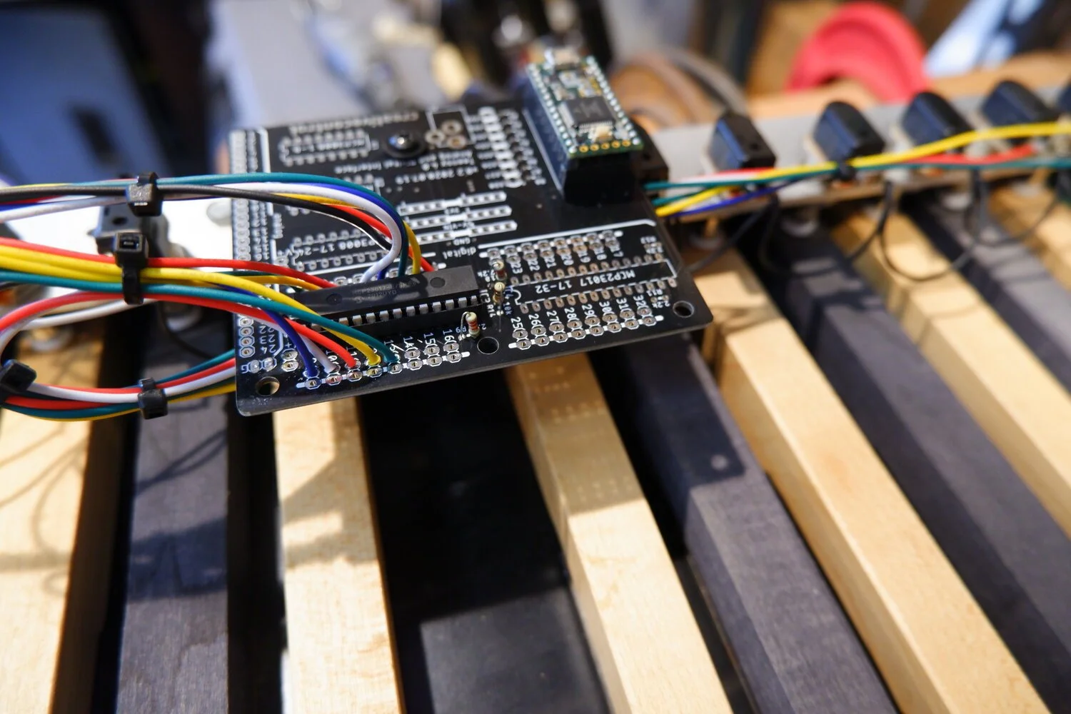 The pedestrial activator is a reclaimed electric organ pedal board turned MIDI controller. The original electronics have been replaced with soft touch momentary switches usually used in boutique guitar pedals. These switches are then read by a Teensy 4.0 microcontroller on custom circuit board designed to simplify the creation of custom MIDI controllers. It outputs MIDI control over USB which can be used to play any software synthesizer or sampler.